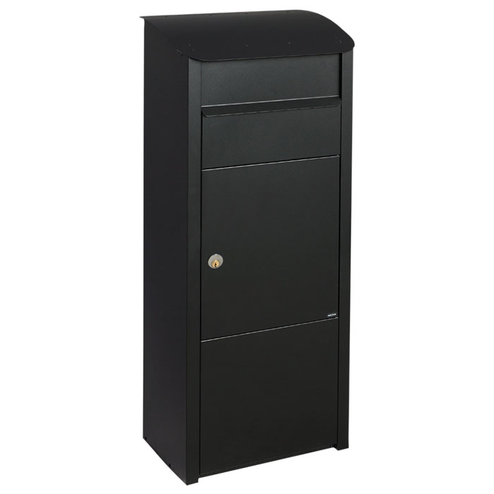 En svart paketpostlåda med extra stort utrymme för post (49 liter), dörren är utrustad med ett lås för att skydda posten mot att bli stulen. Postlådan monteras genom att gjutas ner med gängstavar (ingår).