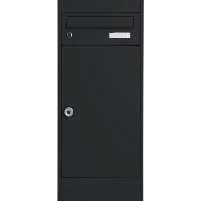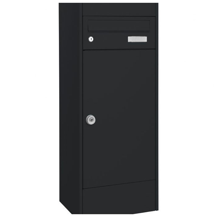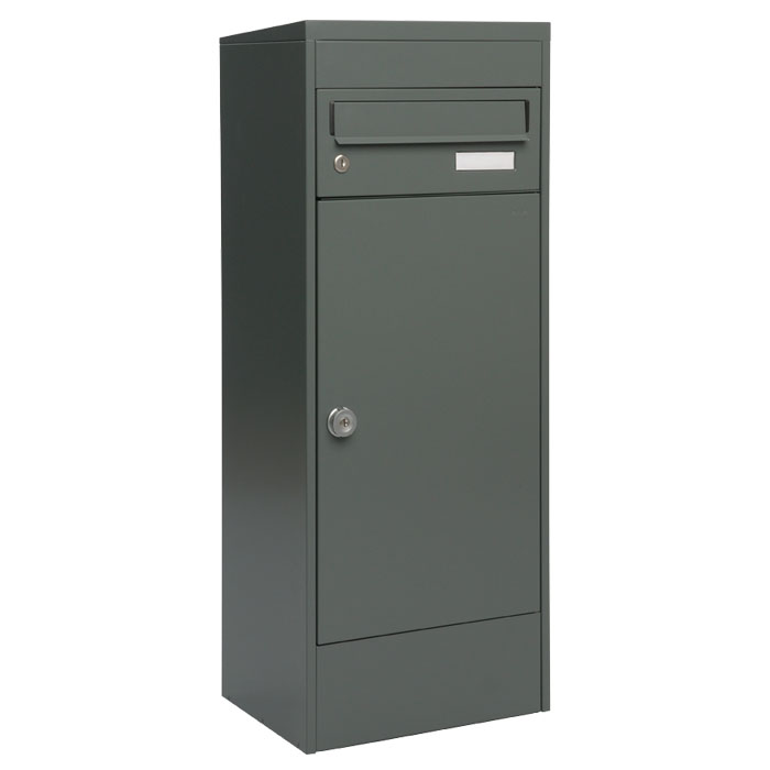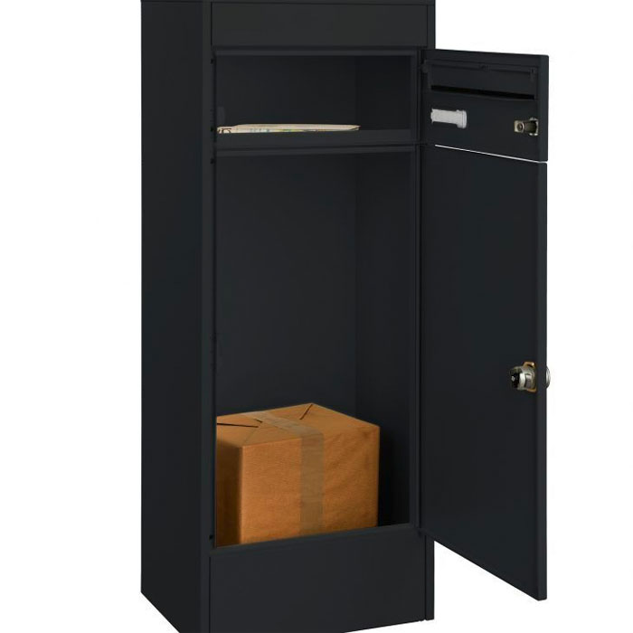 En klassisk paketpostlåda med dubbla fack, ett för brev (9 liter) och ett för paket (81 liter) där paketlådan kan lämnas olåst och sedan kan budbäraren låsa lådan efter paketet har blivit placerat i lådan genom att vrida om låset i stängt läge. Låset kan sedan endast öppna med nyckel. Tillverkad i pulverlackerad stål för lång hållbarhet och skydd mot rost.