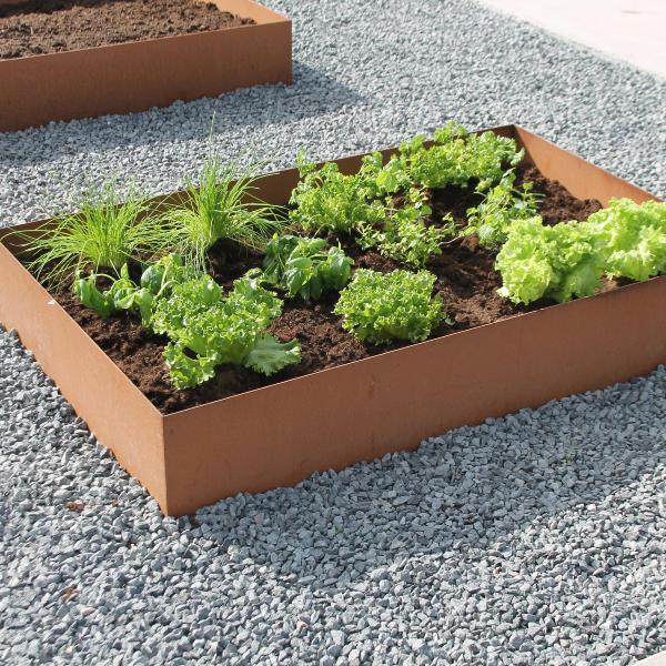 Odlingsram tillverkad i 2 mm. tjock corten. Vid levererans är cortenen obehandlad och den rostiga ytan kommer efter att ha vistats en tid utomhus.