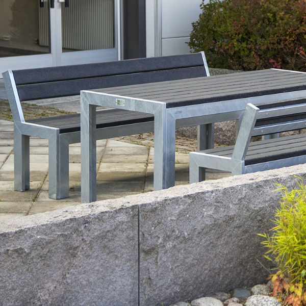 Fördelen med den återvunna plasten är att den är underhållsfri, torkar fort efter regn och kräver inget underhåll. På materialet kan inte alger eller mossa växa, och möblerna kan stå ut året om.
