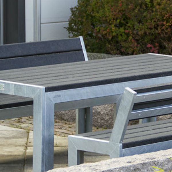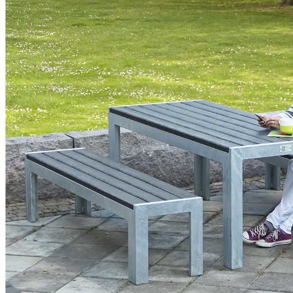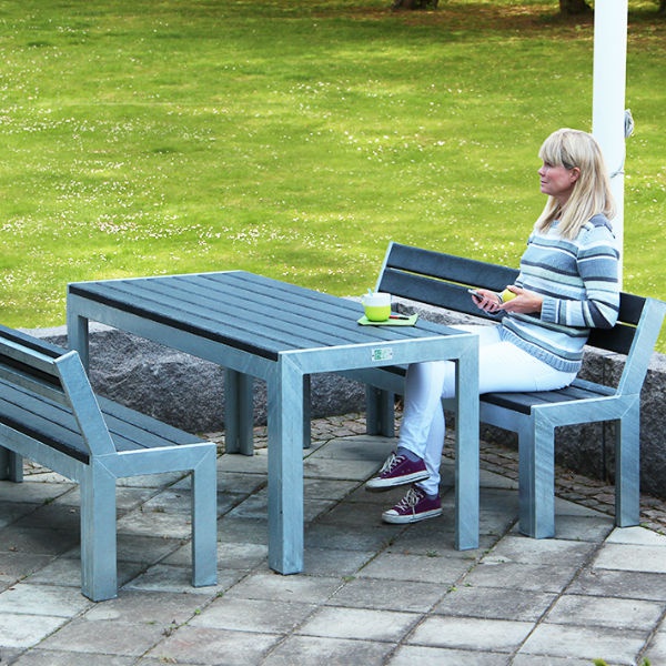 Fördelen med den återvunna plasten är att den är underhållsfri, torkar fort efter regn och kräver inget underhåll. På materialet kan inte alger eller mossa växa, och möblerna kan stå ut året om.