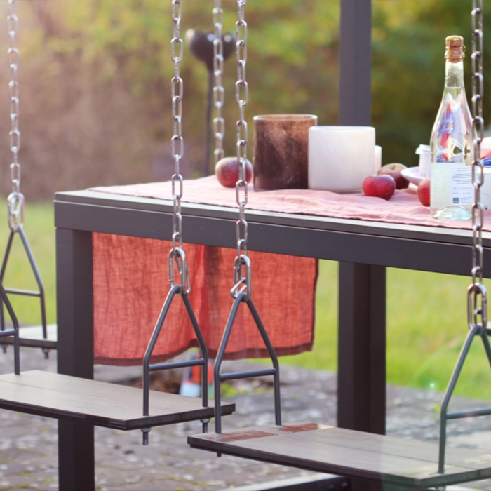 Den eleganta konstruktionen i grå pulverlackad stål och de stilrena sittytorna i grå komposit ger inte bara en modern känsla, utan kräver också minimalt underhåll.