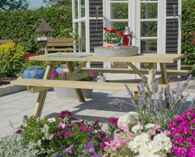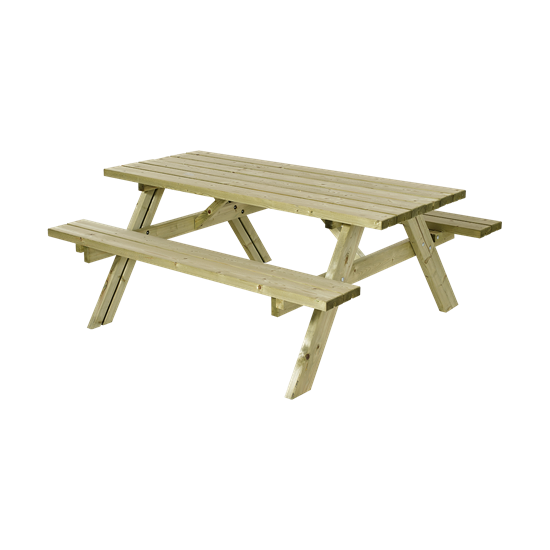 Ett rejält och robust picknickbord med ett klassiskt utseende och uppfällbara sitsar tillverkat i barrträ.