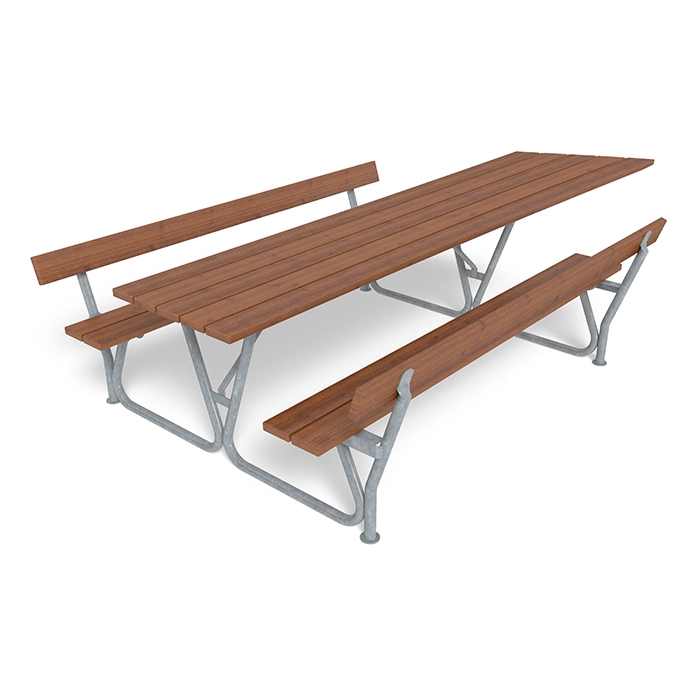 Ljung picnicbord har ryggstöd på båda sidor för extra komfort. Det gör det till ett inbjudande val för att sitta ute och umgås. Bordet passar bra i parker, rastplatser, skolor och bostadsområden. Det ger en bekväm plats för att vila, äta eller träffas.