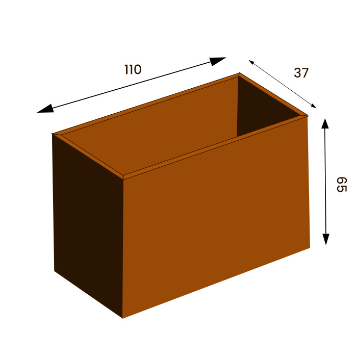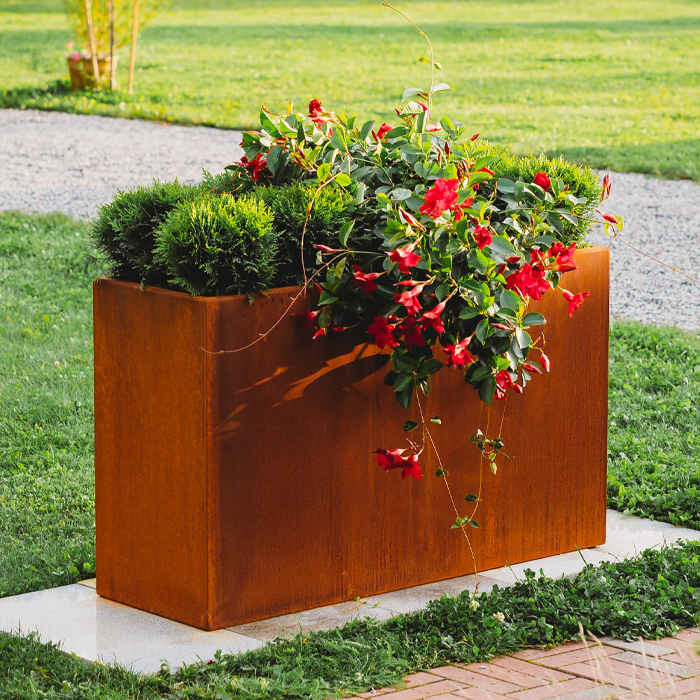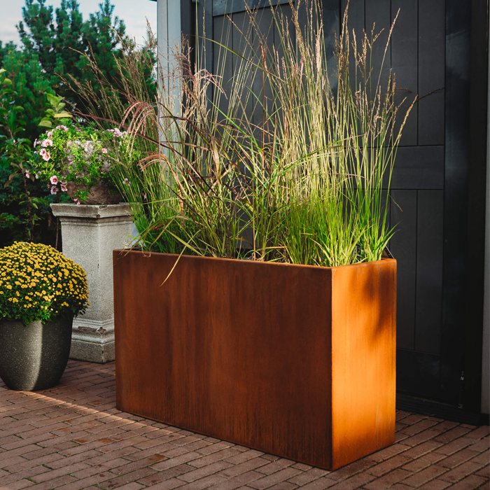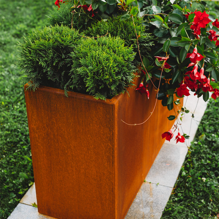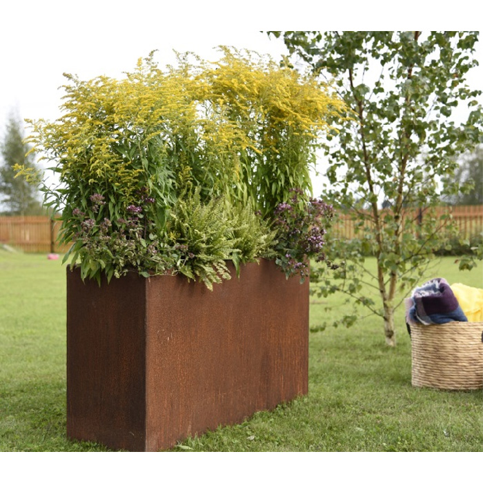 Högt och avlångt planteringskärl i 3 mm-cortenstål, passar perfekt som en snygg avgränsare både i offentliga som privata miljöer.