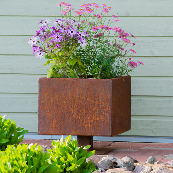 Snyggt och robust planteringskärl på fot, tillverkat i det populära materialet Corten som ger ett snygg rostigt utseende, finns i tre olika storlekar. Tack vare fotens så höjd hamnar planteringskärlet 10 cm ovan mark. Botten är utrustad med dräneringshål.