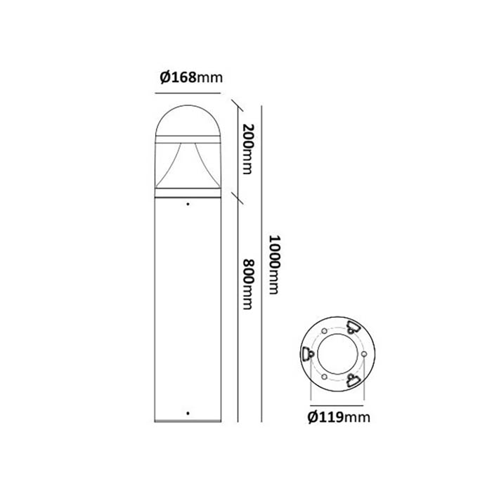 En meter hög ljuspollare med LED-belysning på 15 W, modellen finns i både svart och aluminiumgrått utförande. Stomme i aluminium och en vit reflektor med en kupa i polykarbonat. Kapslad snabbkopplingplint för enkel installation.
