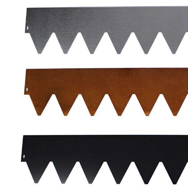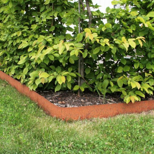 Gällande modellen i Corten: Den rostiga ytan bildas långsamt när Rabattkanten får stå utomhus under en tid. Redan efter någon vecka börjar den rostiga färgen att synas och med tiden blir den mörkare och mörkare. Cortenstålet behöver ett varierat klimat där det utsätts för fuktig luft, och emellanåt får torka helt, för att bäst bilda den rostiga skyddande ytan.