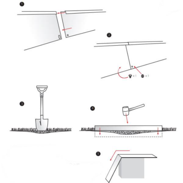 4. Slå försiktigt ner rabattkanten i marken med hjälp av en gummiklubba eller liknande. (min. halva plåtens höjd bör ligga under jord)