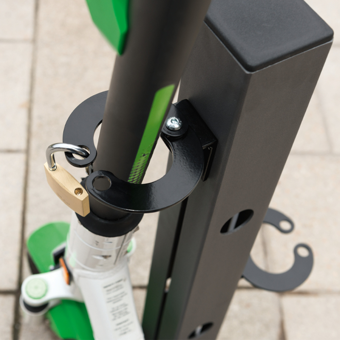 Markmonterat sparkcykelställ med två platser där sparkcyklarna kan parkeras och låsas fast smidigt. Scooterns ram låses smidigt fast i byglarna med hjälp av ett hänglås, passar alla sparkcyklar oavsett märke och modell. Med hjälp av ett sparkcykelställ kan man lätt hålla ordning på platser där parkering av sparkcyklar är ett problem, både på offentliga platser men också till exempel skolor och innergårdar.