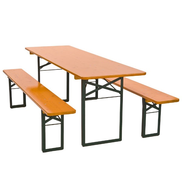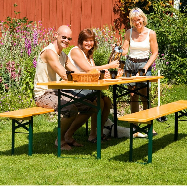 Bord och bänk har hopfällbara ben och är tillverkat för att tåla riktiga kalas.