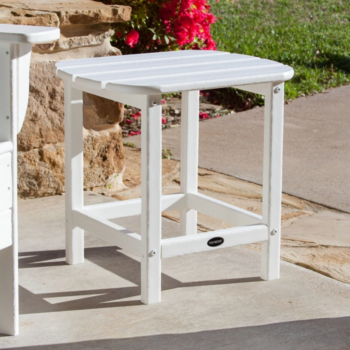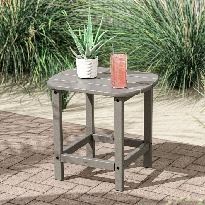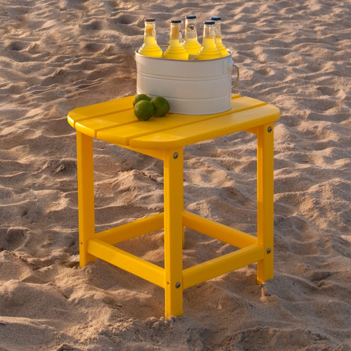 Sidobord som finns i flera olika färger, tillverkat i återvunnet material vilket gör att det kan stå ute året om. Passar utmärkt som komplettering till däckstolar.