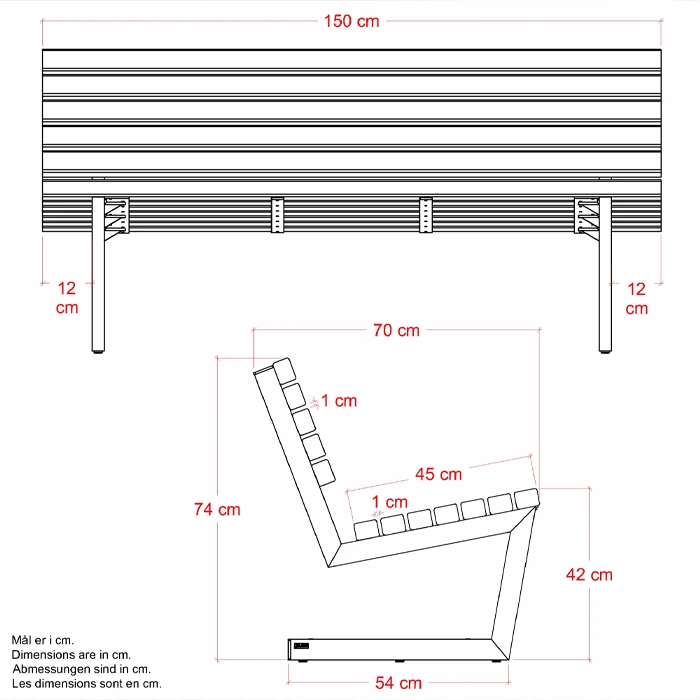 Med sina generösa mått på 150 cm i längd, 70 cm i bredd, en rygghöjd på 74 cm och en sitthöjd på 42 cm erbjuder den gott om plats för två personer att koppla av.