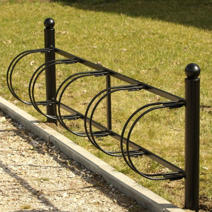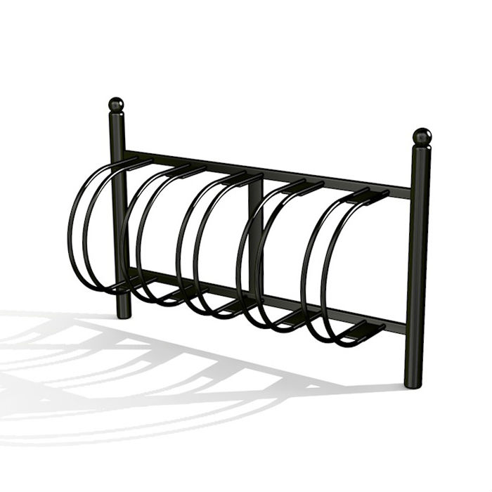 Stilrent cykelställ för 5 platser, tillverkat i pulverlackerat stål och ger en snyggt intryck oavsett miljö.
