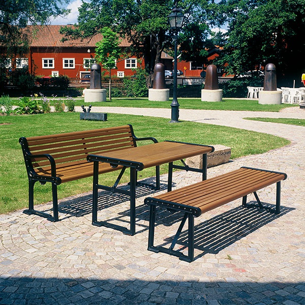Material: Kraftiga gjutjärnsgavlar ytbehandlade med zinkbaserad grundfärg och täcklack av polyestertyp. Träskyddsbehandlad furu. Ytbehandlat med 1 X penetrerande grundlasyr och 2 X filmbildande topplasyr, total filmtjocklek 70 µm, vilket ger en lång livslängd.