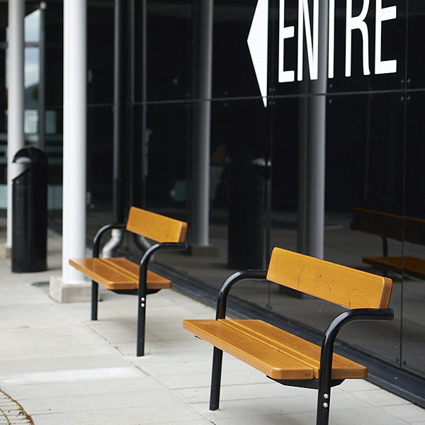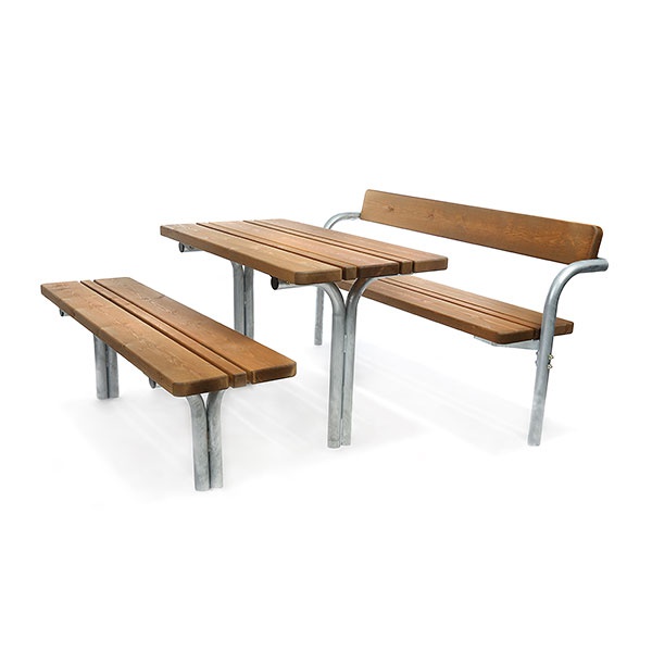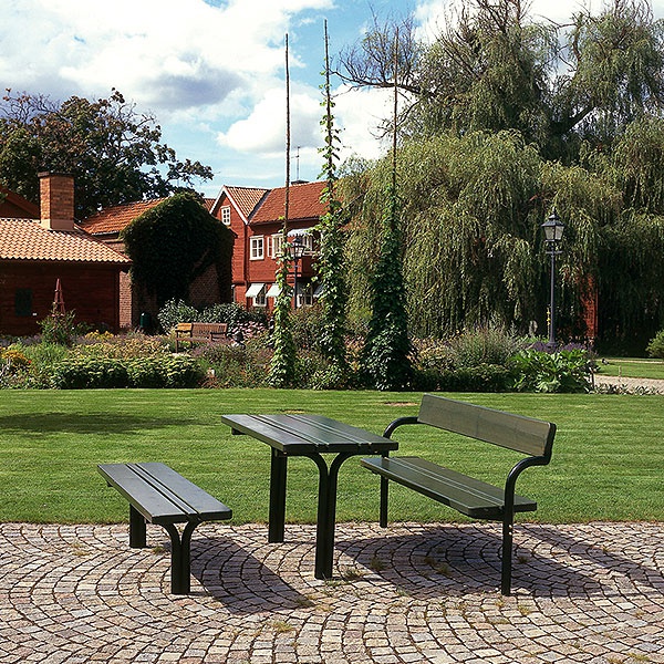 Soffa Rörkröken är en robust soffa som platsgjutes. Både trävirke och stålstativ har extra kraftiga dimensioner. Denna snygga grupp som tål tuffa attacker innefattar även ett bord och bänk.