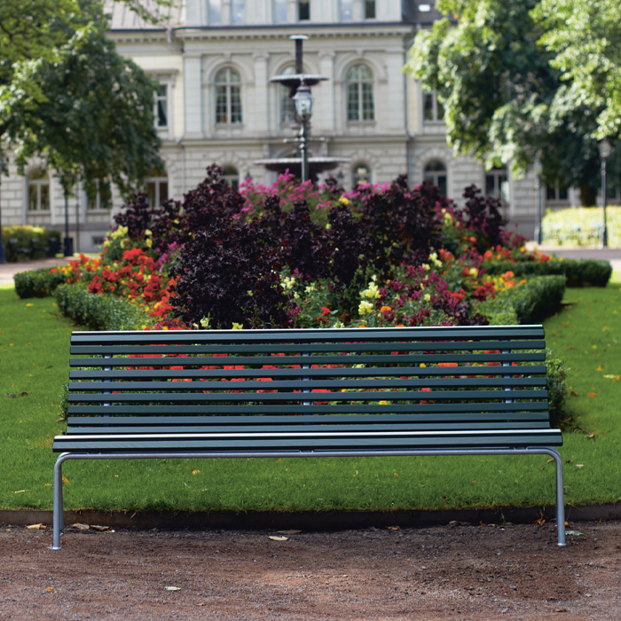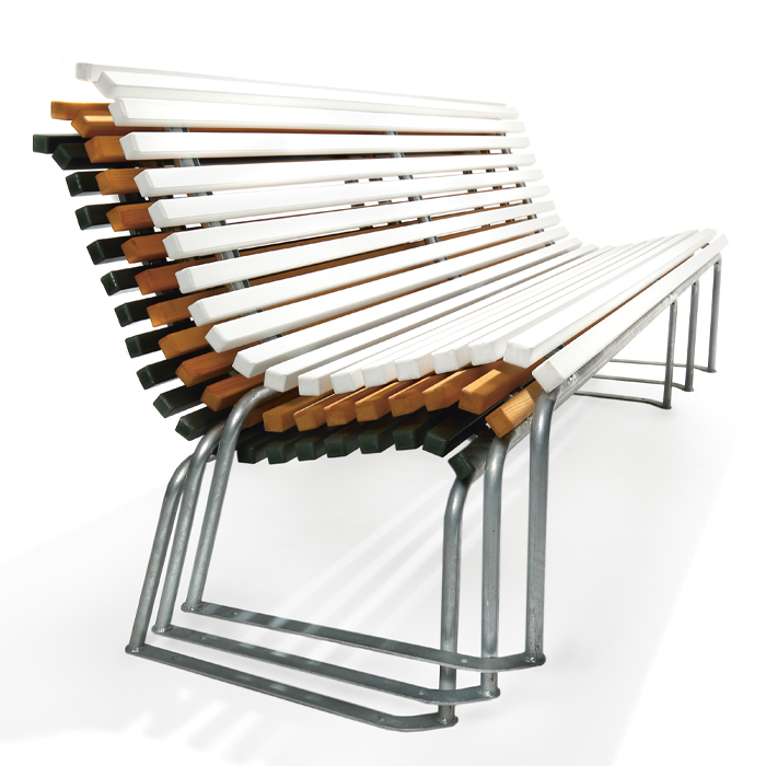 Den klassiska "Stockholmssoffan" med de smala ribborna och den mjukt svängda profilen i sits och ryggstöd gör att denna soffmodell är populär vad gäller komfort och sittriktighet. Soffan som är staplingsbar passar bra in i parkmiljöer, men även utanför företag och köpcentrum eller varför inte utanför hyreshuset. Modellen finns även i brunt och vitt utförande.