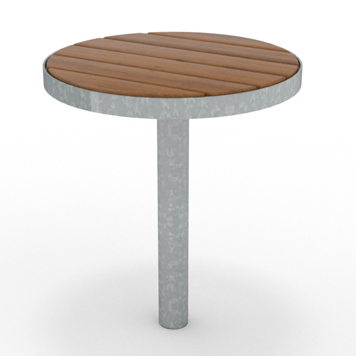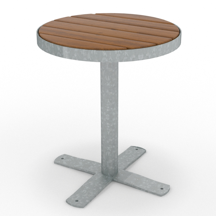 Populära parkbordet Sofiero i en mindra variant med en diameter på 60 cm. Både trävirke och stålstativ har kraftiga dimensioner som tål tuffa tag i den offentliga miljön.