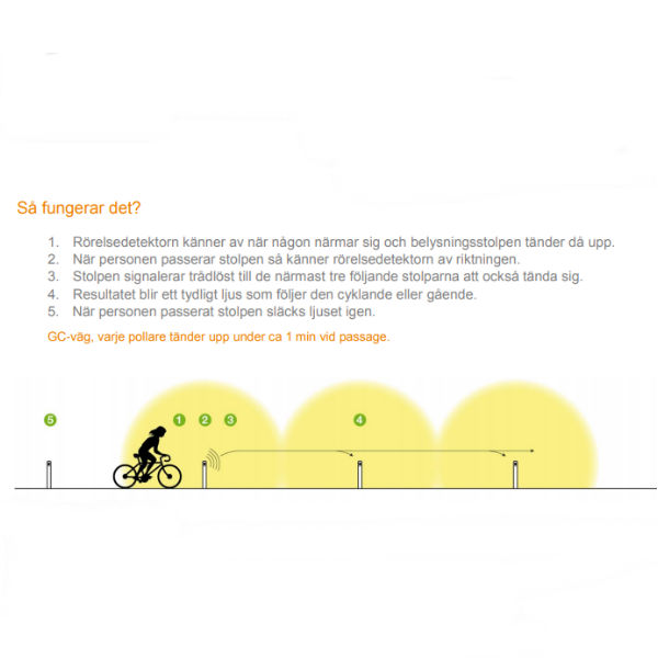 Resultatet blir ett tydligt ljus som följer den cyklande eller gående.