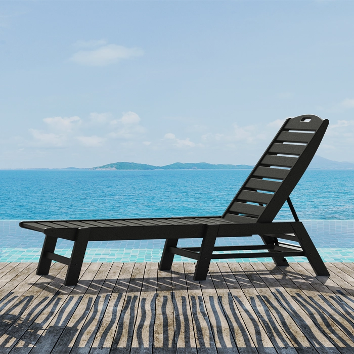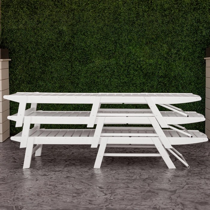 Fäller man ryggen helt kan man lätt stapla flera solsängar på varandra för att spara plats vid förvaring.