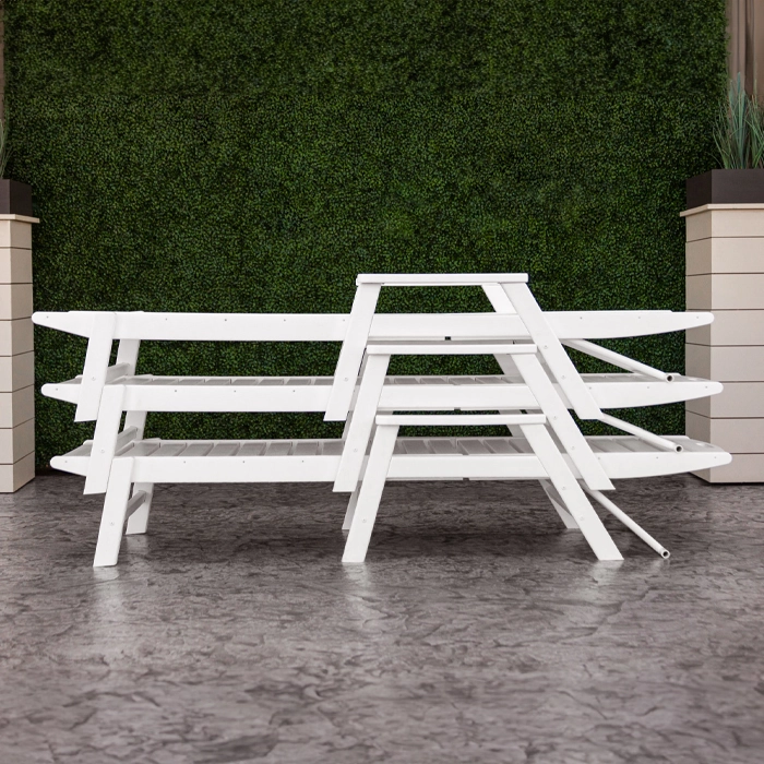 Fäller man ryggen helt kan man lätt stapla flera solsängar på varandra för att spara plats vid förvaring.