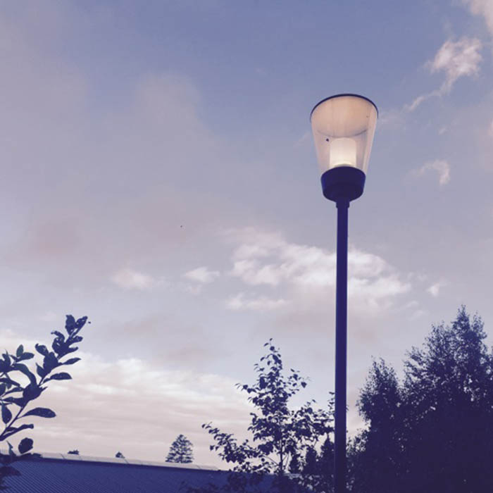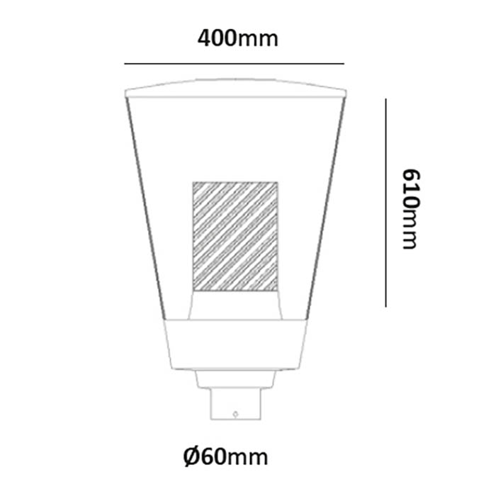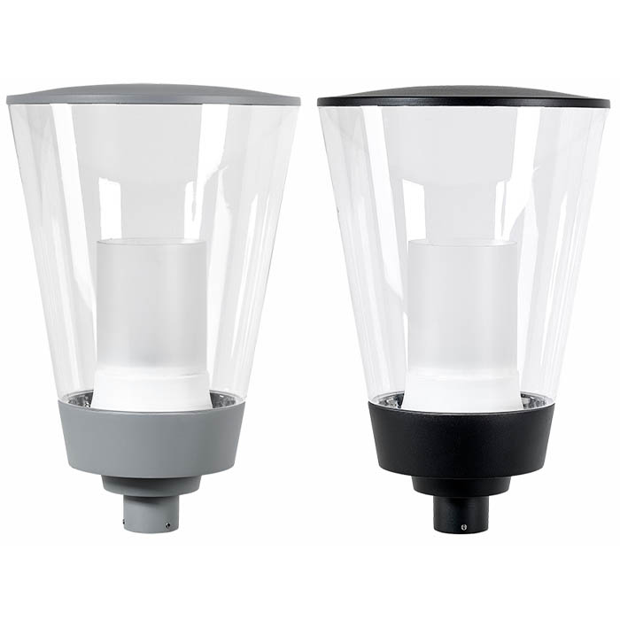 LED-stolparmatur i Lykta serien i modern stil med rotationssymmetrisk avbländad och reflekterad indirekt ljusbild. Kromaterad och pulverlackerad stomme, kupa tillverkad i klar UV-beständig PET-G. Armaturen är bestyckad med en utbytbar LED-enhet. Går att få med nattsänkning. Anpassad för stolptopp 60mm, med kabelavlastning och snabbkopplingsplint 3x2x2,5 mm²¨.