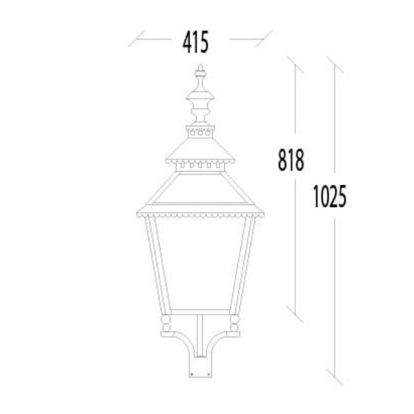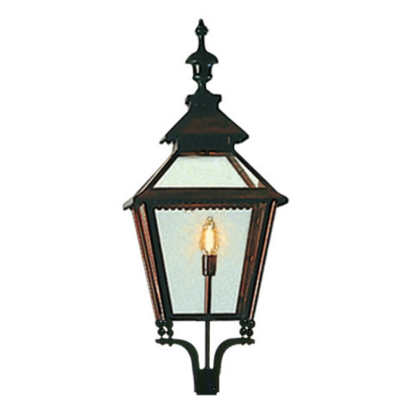 Ståtligt armaturhus i oxiderad och handarbetad koppar. Stilfulla detaljer i koppararbetet samt spira i gjuten dekorerad aluminium. Klart fönsterglas även i takkonstruktionen ger maximalt ljusutsläpp som kan belysa t.ex. fasader och trädkronor. Armaturen har en öppningsbar sidolucka för enkelt byte av ljuskälla. Kombineras till fördel med den ståtliga Jönköpingsstolpen i kraftig ornamenterad gjutjärn - tillsammans en praktpjäs att beundra i generationer. Jönköpingsarmaturer återfinns idag i stadsmiljöer, kulturmiljöer, slott, gårdar och kyrkogårdar.