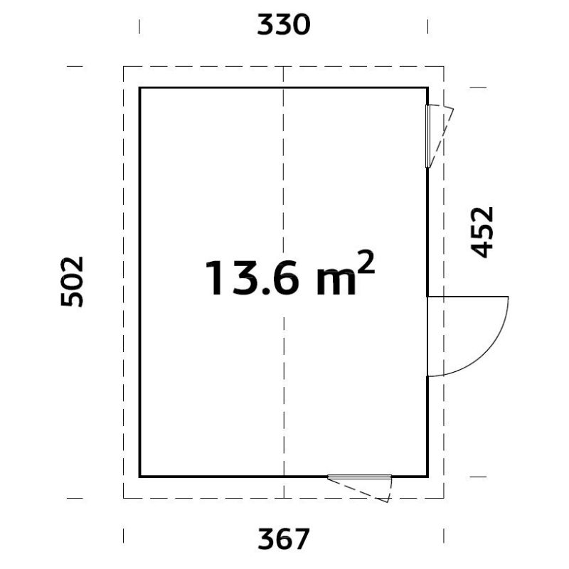 Stilren stuga på 13,6 kvadratmeter med färdig väggelement (med vindskyddsfolie) samt gummitätning vid dörrar och fönster. Med två spröjsade och isolerade fönster gör att stugan har en riklig ljuskälla dagtid, även dörren är isolerad och utrustad med cylinderlås.