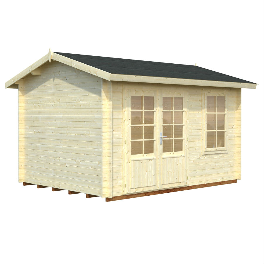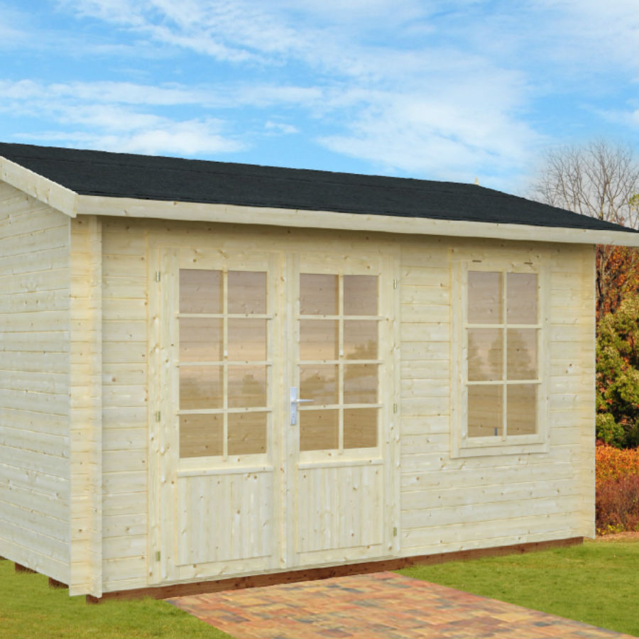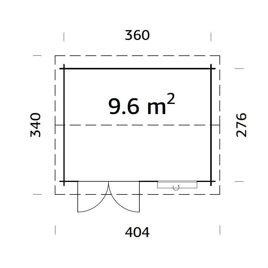 En liten stuga på 9,6 m² tillverkad av 28 mm knuttimmer med vindtäta dubbelhaksknutar. Dörren är en halvglasad pardörr med limträkarm, cylinderlås och rostfri plåt som skyddar tröskel. En öppningsbart enkelfösnter med spröjs ger tillräckligt med ljusinläpp för denna lilla stuga.