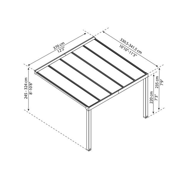 Väggmontering är justerbar mellan höjden 239,4 och 306,7 cm. Terrasstaket kräver en solid, plan yta samt ett solitt väggstöd.