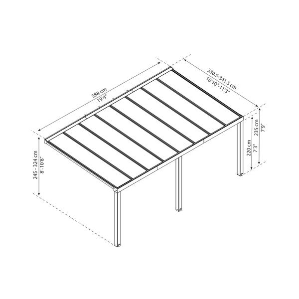 Väggmontering är justerbar mellan höjden 239,4 och 306,7 cm. Terrasstaket kräver en solid, plan yta samt ett solitt väggstöd.