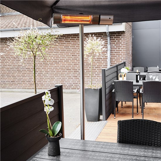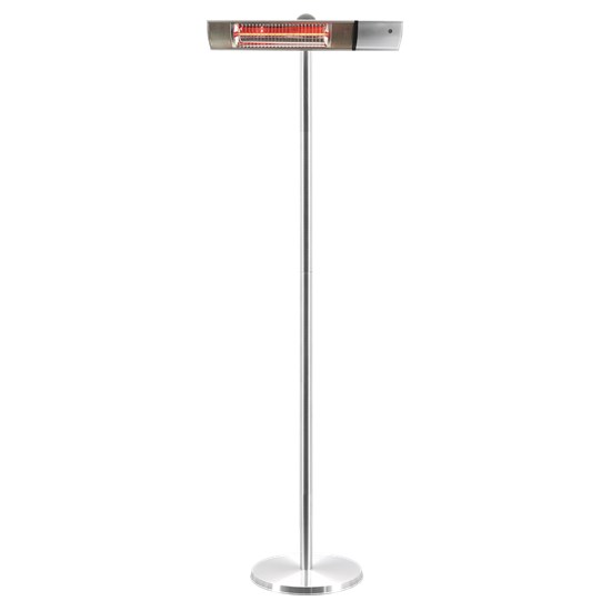 En fristående terrassvärmare som är mycket effektiv med infraröd, kortvågsvärme. Värmaren lämpar sig perfekt för terrassen, uterummet eller balkongen. Placeras lämpligtvis vid änden av ett bord och den ger den behaglig värme i ett område på ca. 5 m2. Utrustad med ett 1500W, infrarött, ultra low glare halogenrör som omvandlar 92 % av energin till behaglig värme, utan att för den delen värma upp luften runt terrassvärmaren. Det finns 3 olika effektnivåer på respektive 500, 1000 och 1500 W. Levereras komplett inklusive fjärrkontroll.