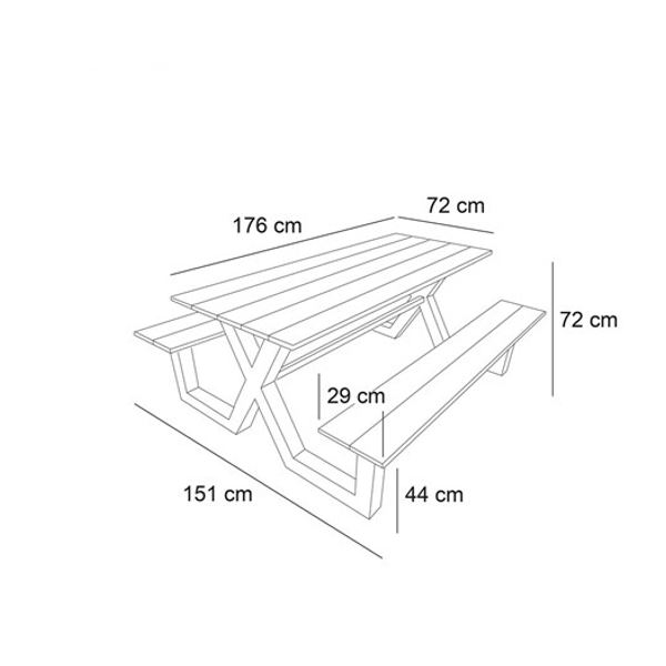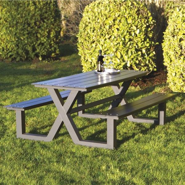 Detta underhållsfria Picknickbord har ett robust utseende med robusta X-formade aluminiumben. Bordet är designat för funktionaliteten då X-benen ger gott om plats för benen, så det blir lätt att sätta sig och lätt att gå ur. Perfekt för den upptagna familjen eller institutionen som inte vill spendera mycket tid på underhåll.