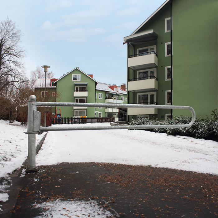 Bilspärr som är kommer med ett brandkårslås och är förberedd för att installera egna cylinderlås, perfekt för till exempel bostadsområde eller där man vill hindra obehörig trafik att ta sig in på området. Tillverkad av robust varmförzinkad stålrör där grindrören är 60 mm ø och moderstolpen 102 mm ø. Montering sker enkelt med hjälp av bultkorgen som gjutas fast i ca. 80 cm ner i marken. Monterad så är höjden på grinden en meter.