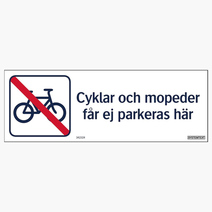 Skylt som informerar både med text och symbol att cyklar och mopeder ej får parkeras på platsen, tillverkad i hårdplast och en storlek på 297x105 mm.