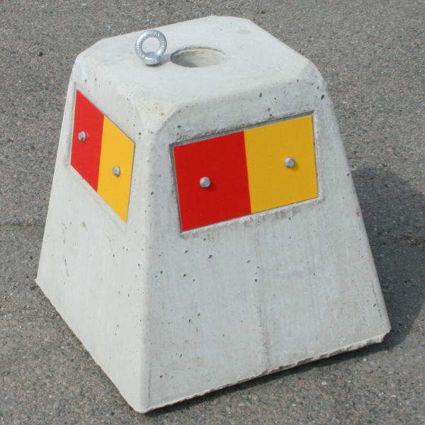 Betongblock med hål för 60 mm vägmärkesstolpe.