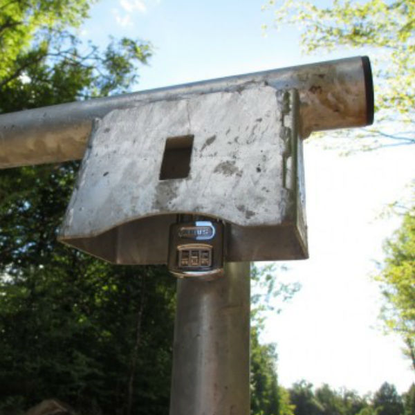 Grinden levereras komplett med nedgjutningsstolpe, låsstolpe, skydd för hänglås.