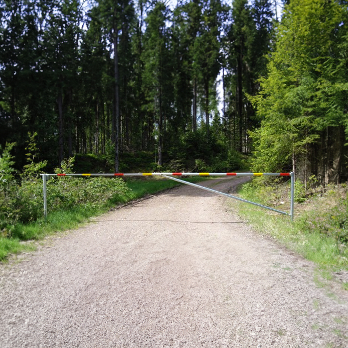 Denna väggrind har en mycket kraftig och gedigen konstruktion. Samtliga delar är av stålrör. De båda grindstolparna är 1,8 m långa. Grind delen innehåller ett förlängningsrör som teleskopiskt kan reglera längden mellan 5,2 och 9,5 meter. Förlängningsröret kan låsas vid den ena grindstolpen. Grinden är varmgalvaniserad, samt försedd med röda och gula reflexfält. Denna grind är perfekt för att stänga av enskilda vägar eller infarter och platsgjutes.