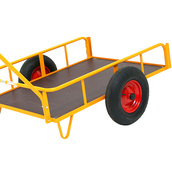 Hörby bruk Paketkärra har en robust och kraftig konstruktion och lämpar sig för transport av tyngre gods. Flaket är tillverkat av filmbelagd plywood av korsvis limmade björkfaner, exteriörlimmad. Kanterna är förseglade med utomhusbeständig brun färg. Räcket är tillverkat av stålrör på tre sidor.