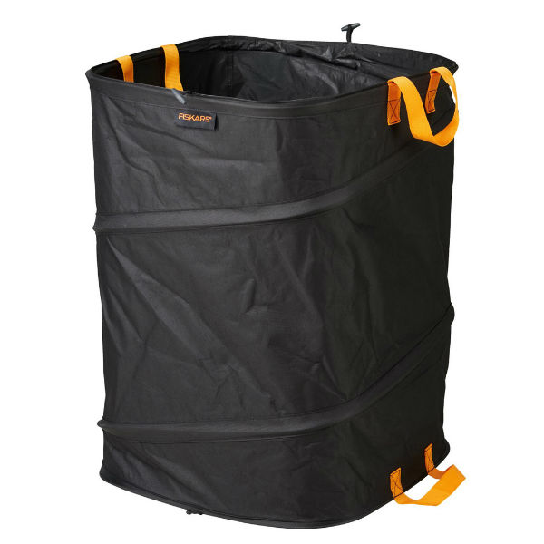 Fiskar Trädgårdssäck Ergo Pop Up är har en fyrkantig utformning för att man enkelt skall kunna lägga säcken på marken och kratta in löv direkt utan att behöva lyfta