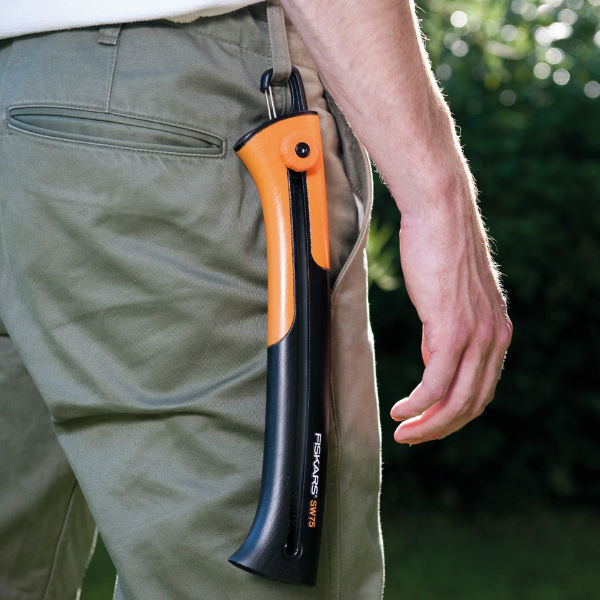 Fiskars Trädgårdssåg sågar effektivt färska grenar. Ny design med en säkerhetsklipp som du lätt kan hänga i byxorna. När sågen är utdragen dras klippen in i handtaget.