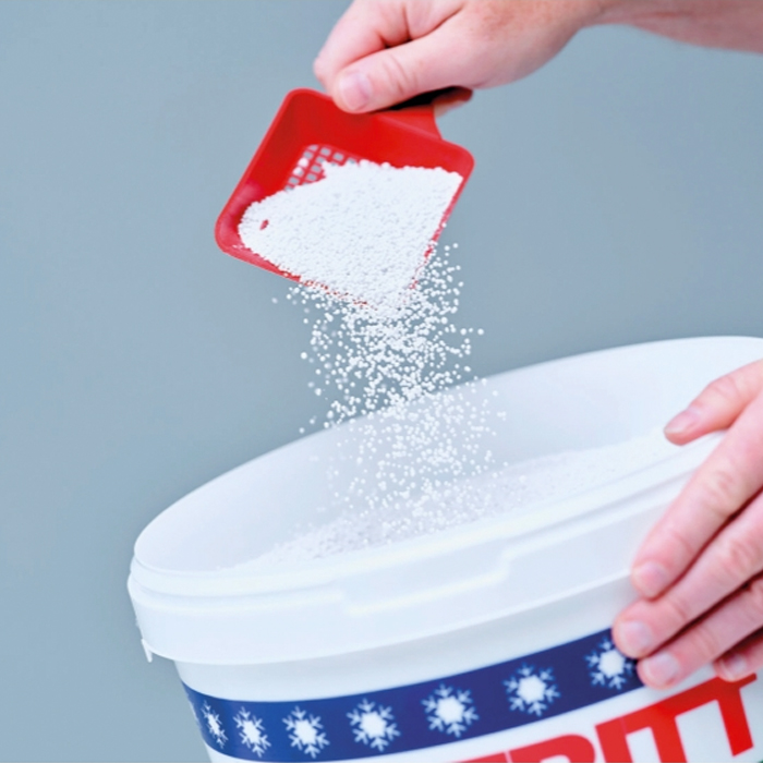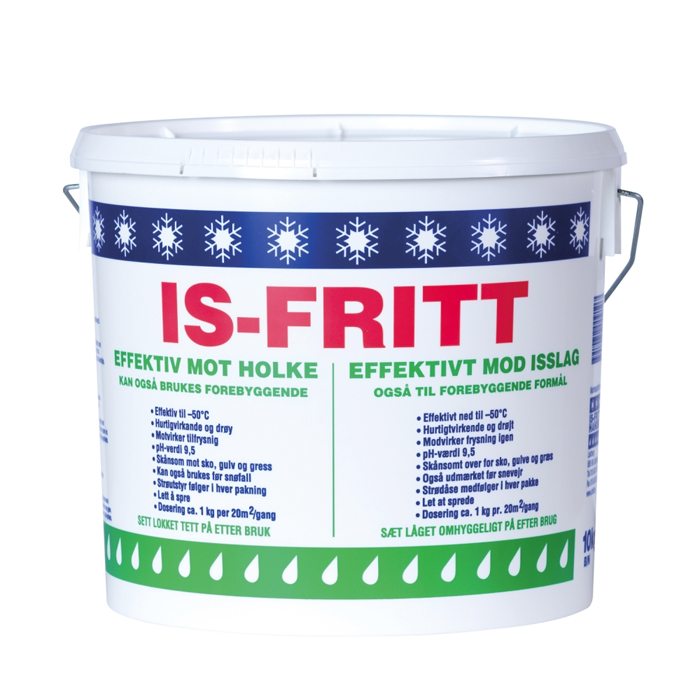 Ett issmältningsmedel som effektivt förebygger halkskador, finns i hinkar om 4 respektive 10 kg. IS-FRITT skiljer sig från vanligt vägsalt eller tösalt, det är betydligt effektivare och mer snabbverkande. Detta beror på den aktiva beståndsdelen: ren, högkoncentrerad kalciumklorid. Isfritt är granulerat och lätt att sprida.