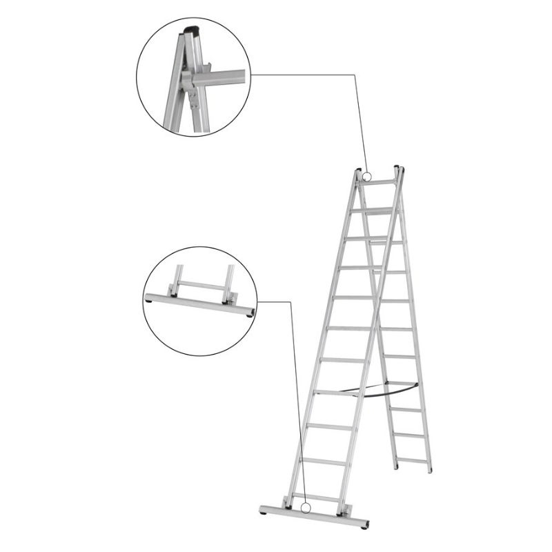 Rejäl kombistege tillverkad i kraftig I-profil som levereras tillsammans med en stegfot och glidskydd i gummi, kan användas som utskjutsstege, kombistege (fristående) eller som 2 stycken enkelstegar.