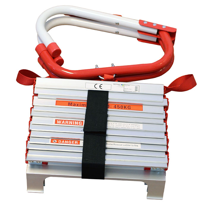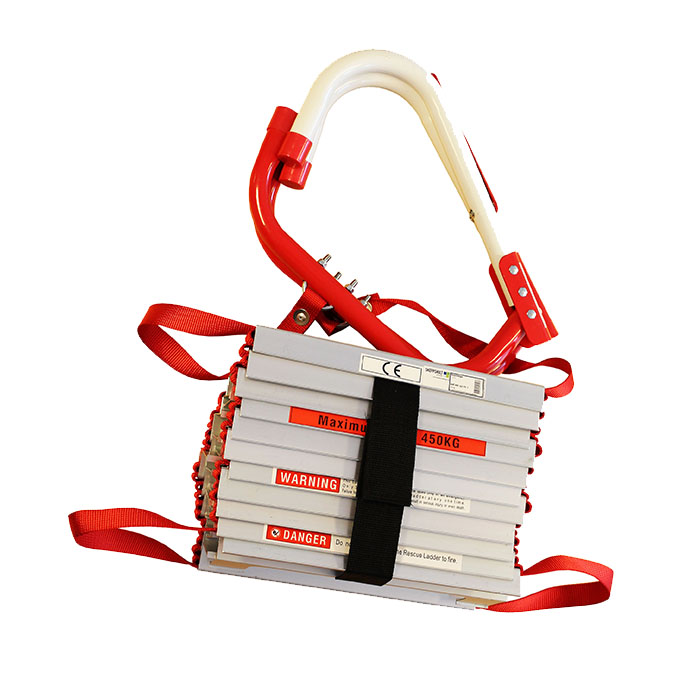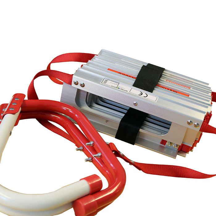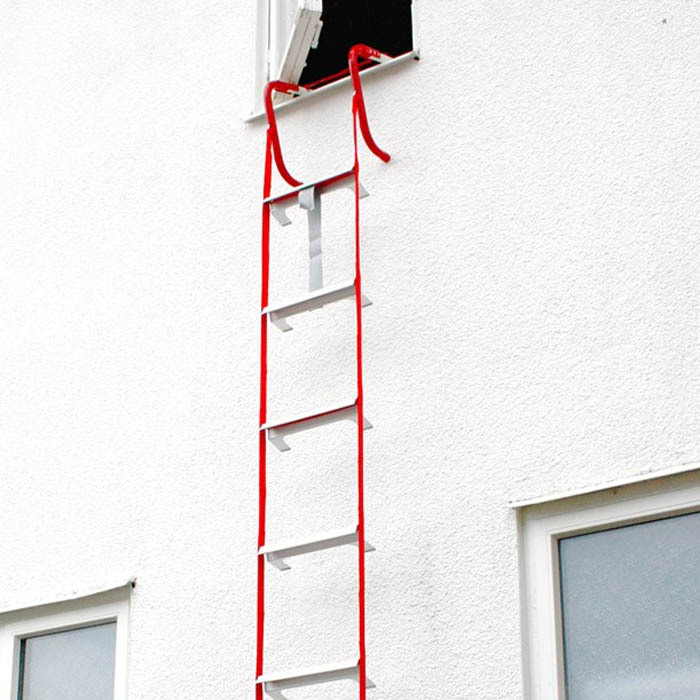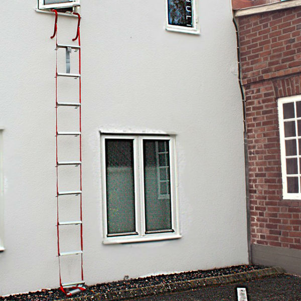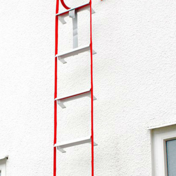 Denna repstege är en bra och billig livförsäkring som bör finnas i varje hem. Repstegen som är till för utrymning är tillverkad av aluminiumsteg med vävda flamsäkra PP-band. Stegen har en distans på 80 mm från fasaden. Man vecklar enkelt ut stegen med ett handgrepp. Stegen går att använda på väggtjocklekar mellan 230-300 mm.