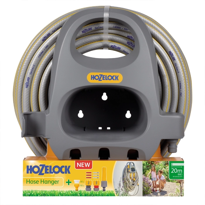 Denna praktiska slanghållare levereras med 20 meter 12,5 mm slang och erbjuder en smart lösning för bekväm förvaring. Hållaren inkluderar även fästen för kopplingar och munstycke samt extra förvaringsutrymme i fronten för att hålla allt organiserat.