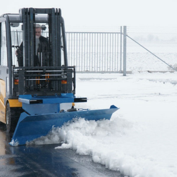 Det går enkelt och snabbt montera plogen på truckens gafflar.
