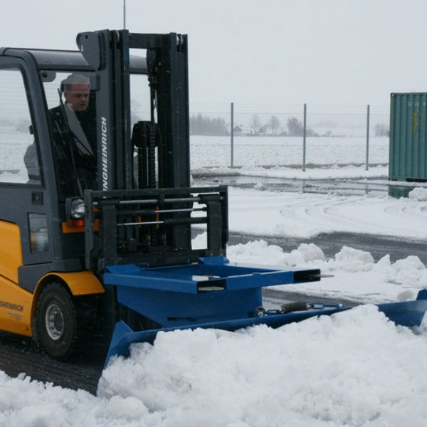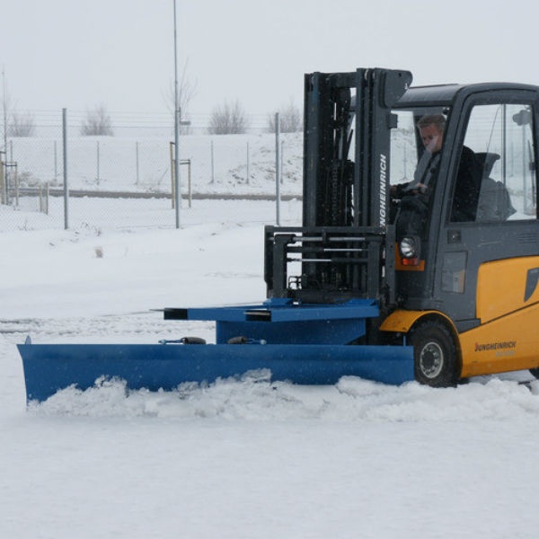 Det går enkelt och snabbt montera plogen på truckens gafflar.
