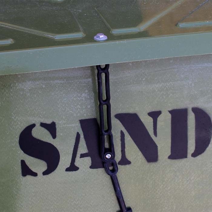 Utrusta sandbehållaren med ett stropplås i gummi för att motverka att vind blåser upp locket, passar endasttill sandbehållare den ligger som tillval till.