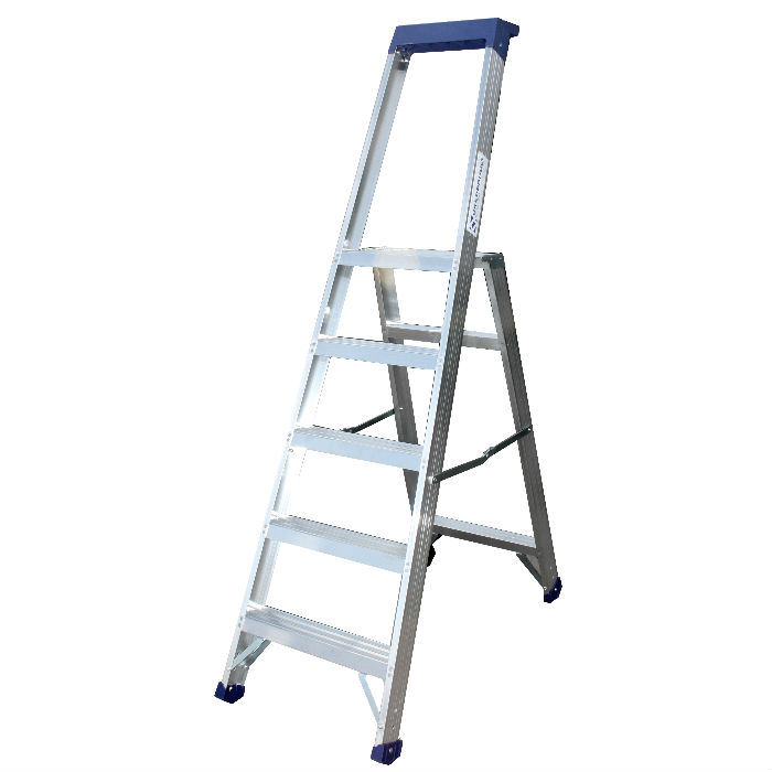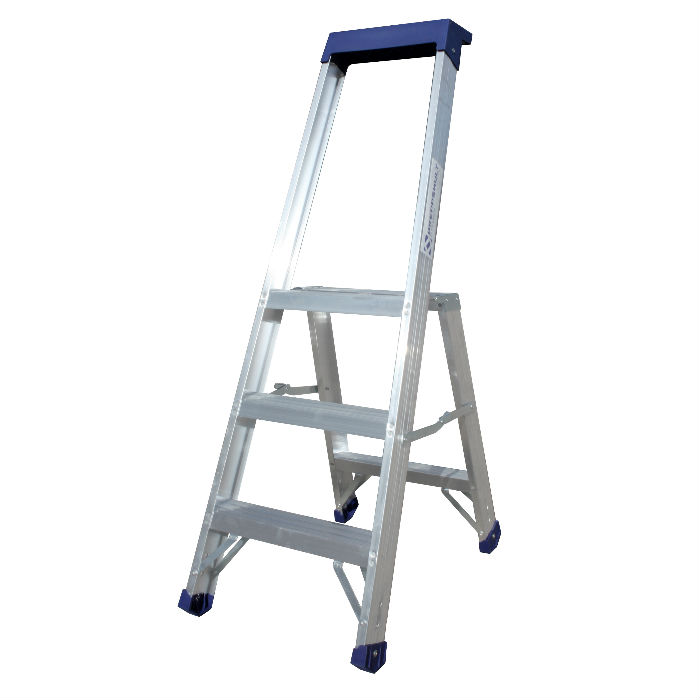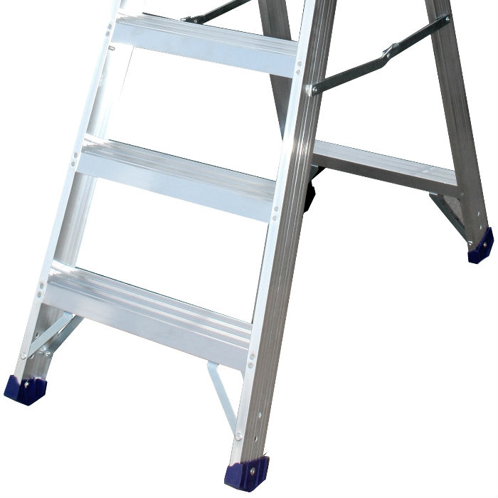 Denna stabila och robusta trappstege i aluminium tål tuffa tag och finns i fler olika längder, 3 till 12 steg. Stegen har hydraulnitade steg och en stabil plattform på 375x250 mm, stegdjupet är 81 mm. Varje fot är utrustad med fötter i plast som ger ett bra glidskydd samtidigt som det skyddar underlaget.