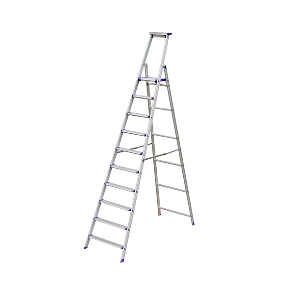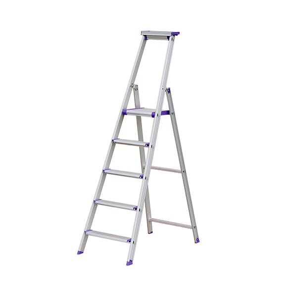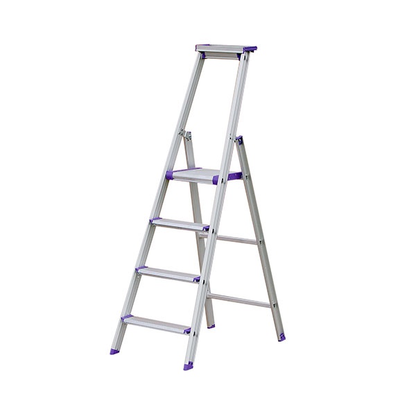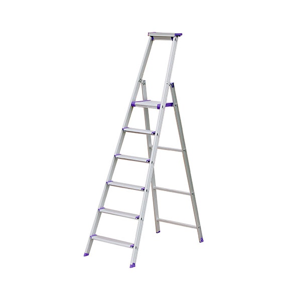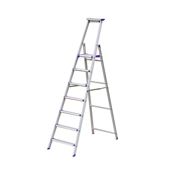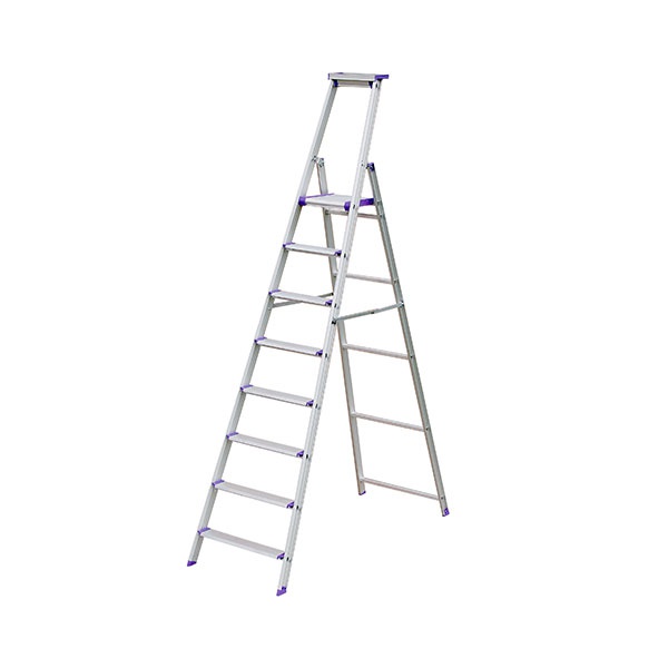 Det unika trappsteget är 80 mm djupt, utformat med förlängd framkant för bästa ergonomi. Anodiserade stegsidor och verktygshylla vilket inte svärtar ned dina händer.